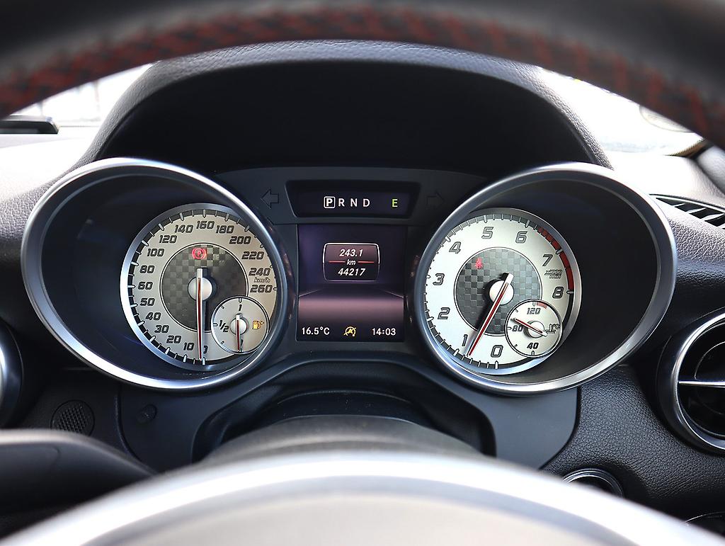 Sink into its cockpit, where red seatbelts pop against premium trim, and black AMG alloys finish the aggressive stance. Features like Adaptive Cruise Control, heated neck-level AirScarf, paddle shifters, Bluetooth streaming, and automatic LED headlamps remind you this is luxury with bite.