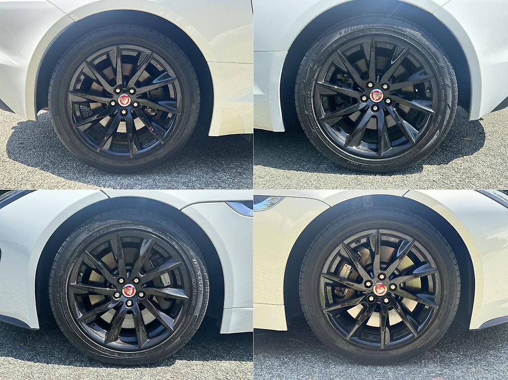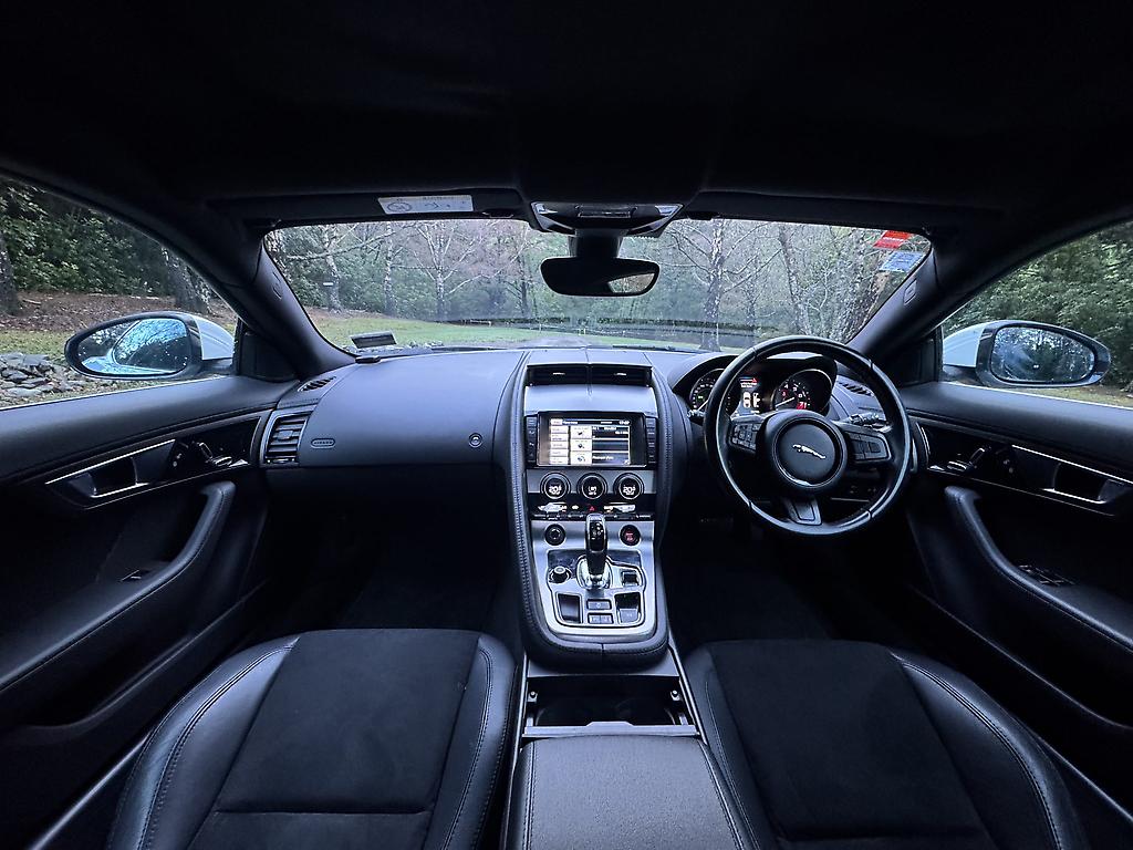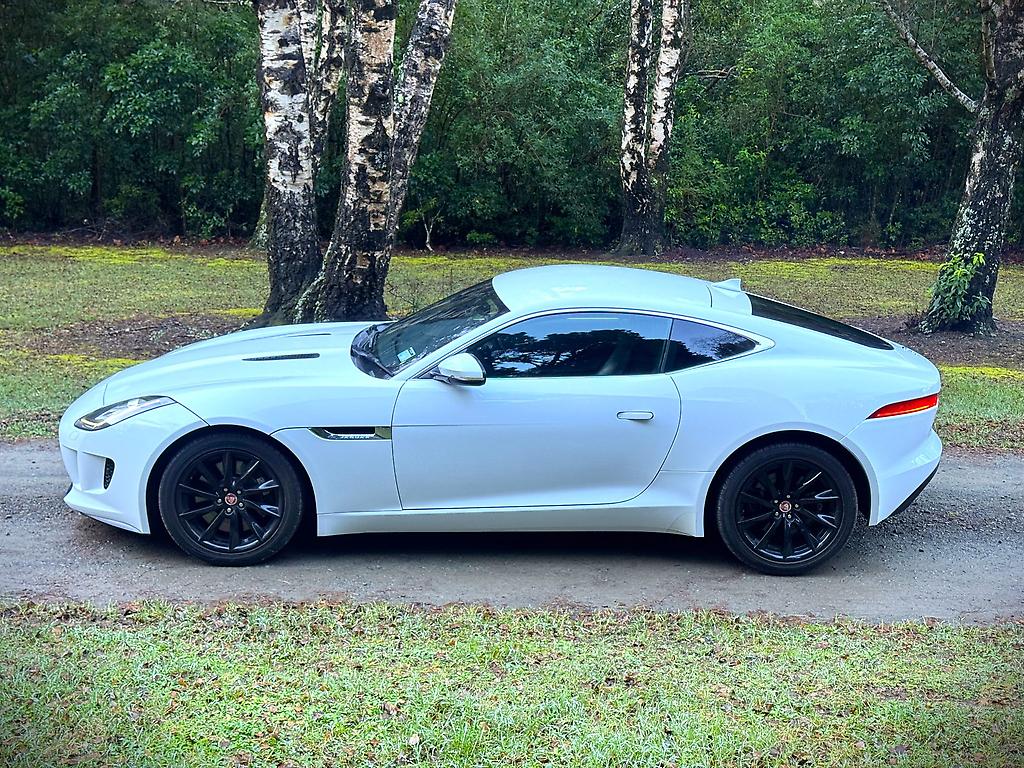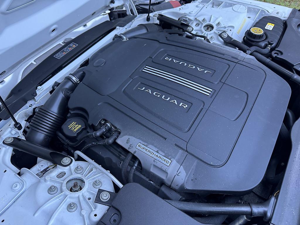 The Jaguar F-Type 3.0 V6 Supercharged in pristine white is a striking blend of elegance and power. Its sleek, aerodynamic silhouette is accentuated by bold, black 20-inch alloy wheels, creating a sharp contrast against the crisp white bodywork. Under the hood, the supercharged 3.0-liter V6 engine delivers an exhilarating performance, producing 340 horsepower that propels the car with effortless precision and a distinctive growl.