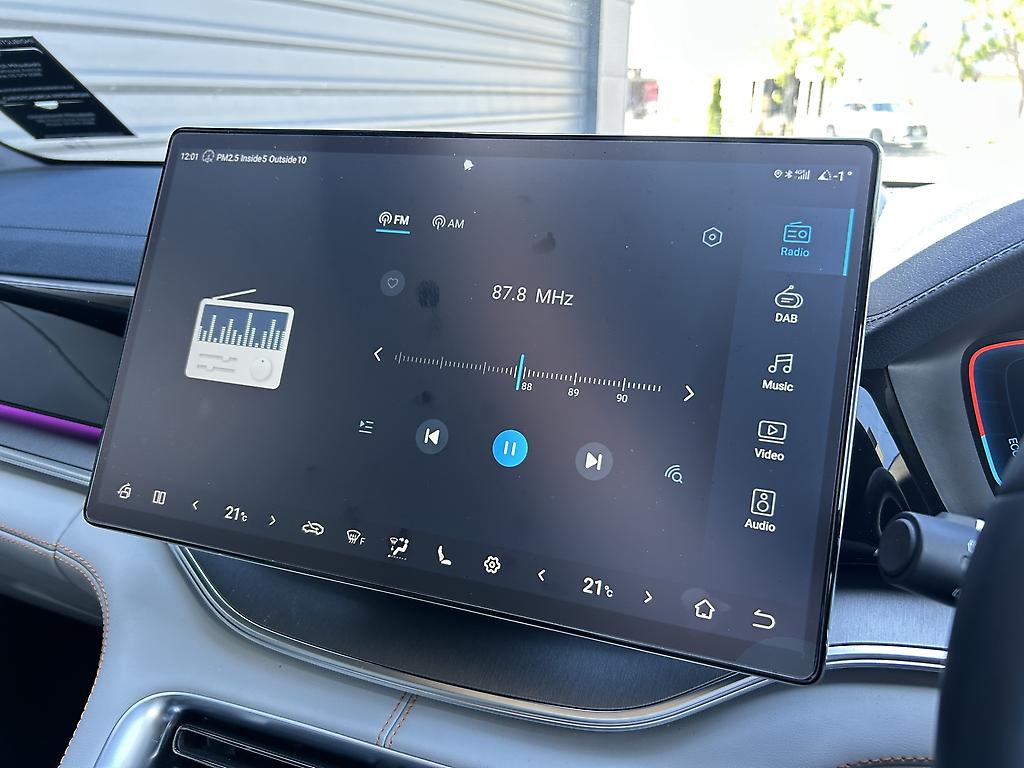 A large 15.6" rotating touchscreen with wireless Apple CarPlay and Android Auto, plus wireless charging.