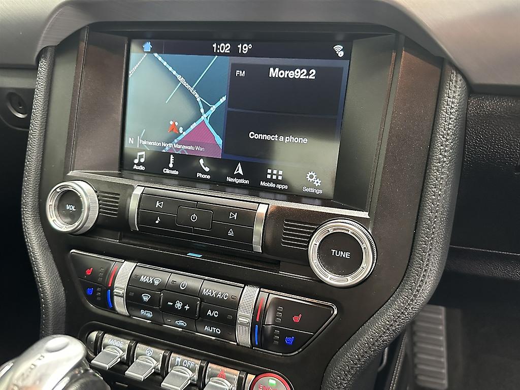 5.0L Ti-VCT V8 339kw with active exhaust 10 speed automatic 19" alloys Brembo brake pack Bonnet vents LED headlights, daytime running lights & fog lights Full leather interior Dual zone climate air con Adaptive cruise control Sat Nav SYNC®3 with Apple CarPlay, Android Auto and Bluetooth®8 12.3 Full TFT/LCD colour instrument cluster 12 speaker B&O audio system Rear parking sensors Reverse camera 8 colour touch screen Collision mitigation system Autonomous emergency braking Tyre pressure monitoring system Automatic headlights Rain sensing wipers 6 x airbags Tinted windows Fresh WOF & service